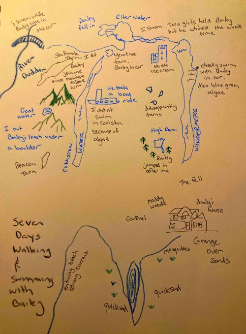 Image: Kristina Rothstein, map drawing “Seven Days Walking & Swimming With Bailey,” Lake District, 2024