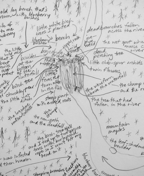 Image: Marlene Creates, detail of the memory map drawing in “Spots of Memory: what I remembered during one month away after six years on Blast Hole Pond Road, Newfoundland 2008”, collection: National Gallery of Canada, Ottawa.